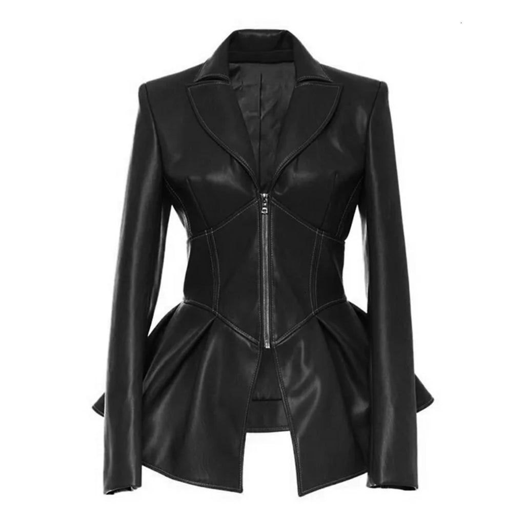 Biker Style Patchwork Irregular Leather Jacket Lapel Collar Long Sleeve High Waist