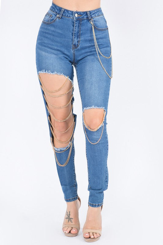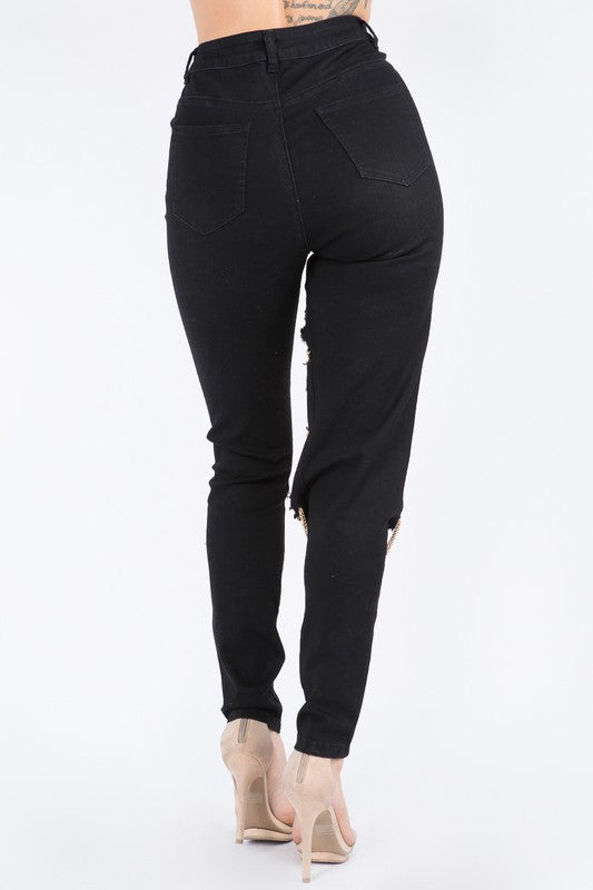 HIGH WAIST SKINNY JEANS WITH CHAINS - BUTTON CLOSURE HIGH WAIST JEANS - CUT OUT TRIMS WITH CHAINS - SKINNY FITTING SIZE S : WAIST - 26.5 INCH, INSEAM - 28 INCH *JUNIOR SIZING IN GENERAL IS MORE FITTING AND SITS TIGHTER AVAILABLE IN JUNIOR AND JUNIOR PLUS SIZING IMPORTED, DESIGNED IN USA