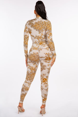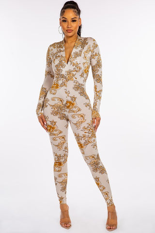 - Style: Casual, Elegant, Sexy - Color: Khaki - Pattern Type: Baroque Print - Length: Long, Full - Season: Spring, Summer - Details: Catsuit, Wrap Top - Fit Type: Slim Fit - Neckline: Low Neck, V neck - Sleeve Length: Long Sleeve - Sheer: NO - Fabric: Stretch - 92%Polyester 8%Spandex