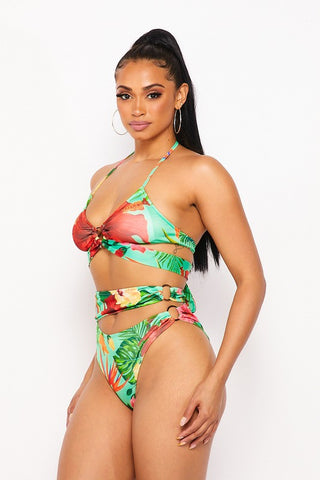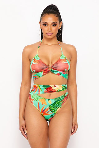 Swim Suit floral print Gold Ring Trim Model is wearing a size small