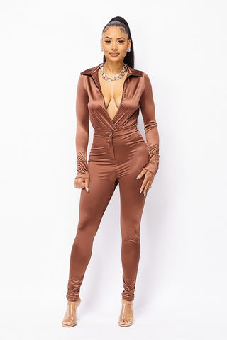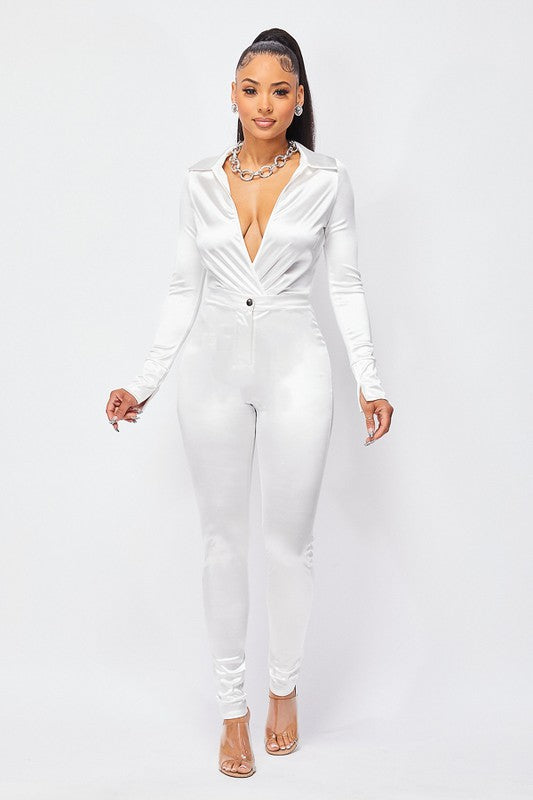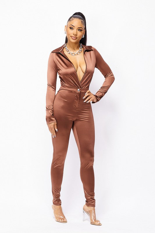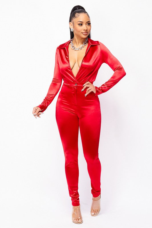 DEEP V NECK SATIN BLOUSE BODYSUIT AND PATS SET
