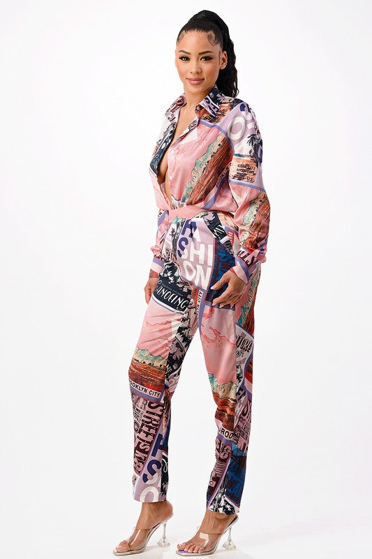 *TOP* - Oversize shirt blouse - Placement print collar button down with matching pants - Cuffed long sleeves - Comes in two colors - 100% Polyester *PANTS* * High-Waisted pants * Elastic Waistband. * Side pocket with Pleats.
