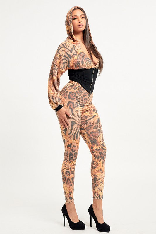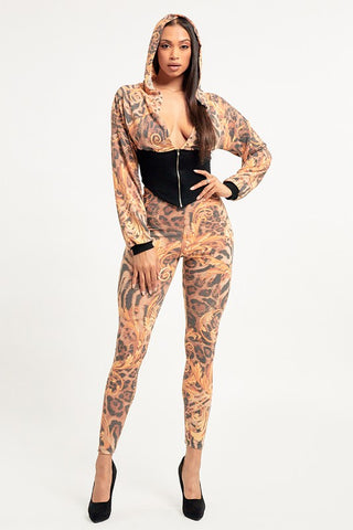 - Corset style zipper front hoodie & legging pant - 63% POLYESTER, 34% RAYON, 3% SPANDEX - Made in USA * MODEL IS 5'7" AND IS WEARING A SMALL.