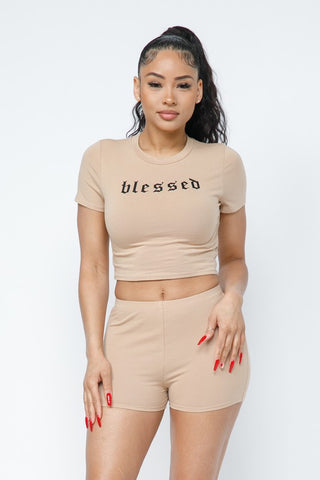 Cotton Spandex Front "BLESSED" Screen Short Sleeve Crop Top And Shorts Set