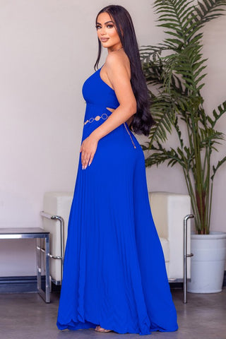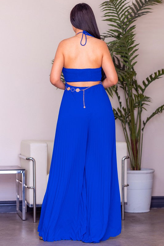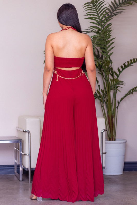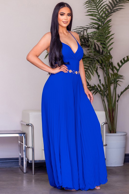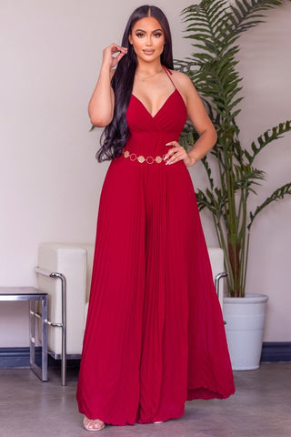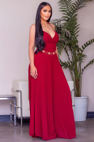 This solid sleeveless pleated jumpsuit features a surplice neck, spaghetti strap, cinched waist, chain belt, pleated skirt body, maxi length and all over solid print.