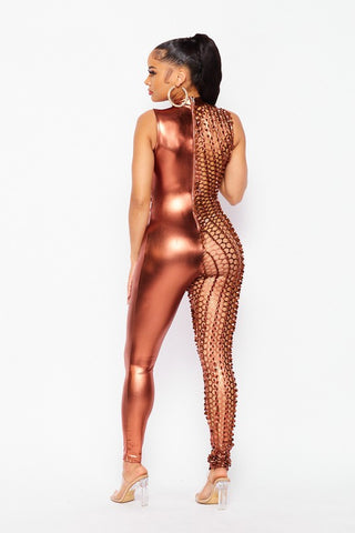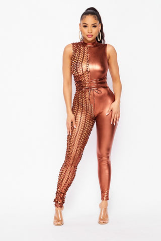 SHINY MOCK NECK JUMPSUIT FEATURES HALF PEEK HOLES AND HAVE FULL WITH CENTER TIE STRING AND BACK ZIPPER FOR CLOSURE. SELF : 95% POLYESTER 5% SPANDEX