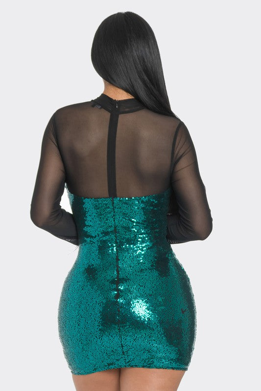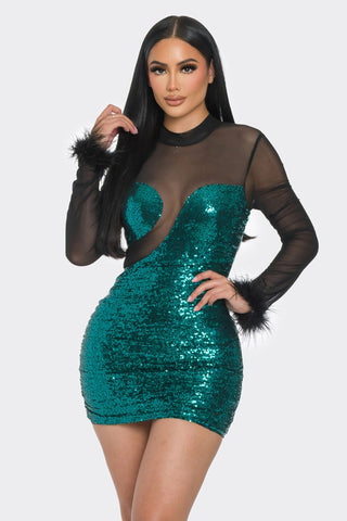 FEATURING A SEQUIN DRESS WITH A MOCK NECKLINE, FIGURE-HUGGING FIT AND MESH SLEEVES. WITH FLUFINESS TO THE END OF THE SLEEVES. PERFECT FOR A FLASHY NIGHT OUT.