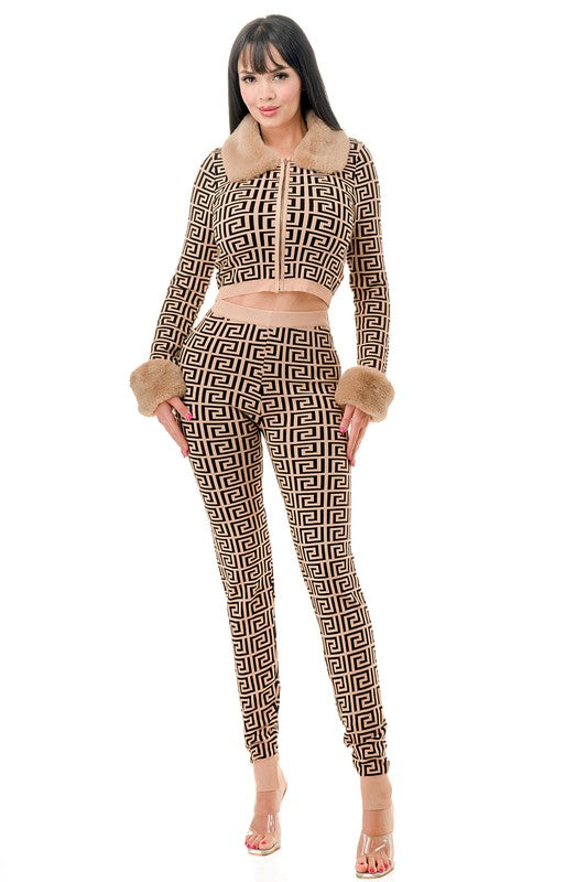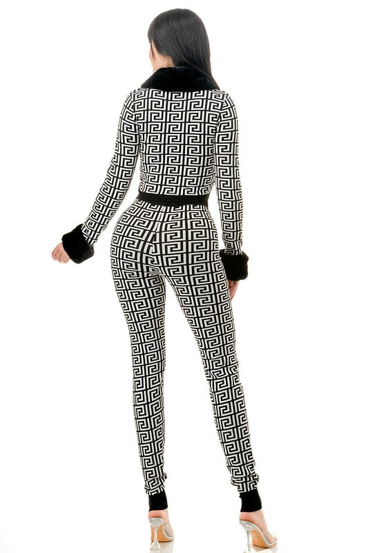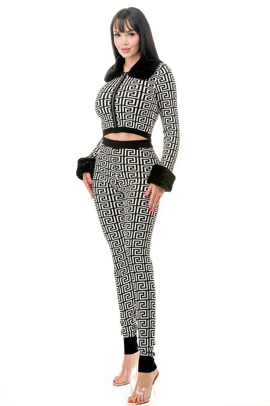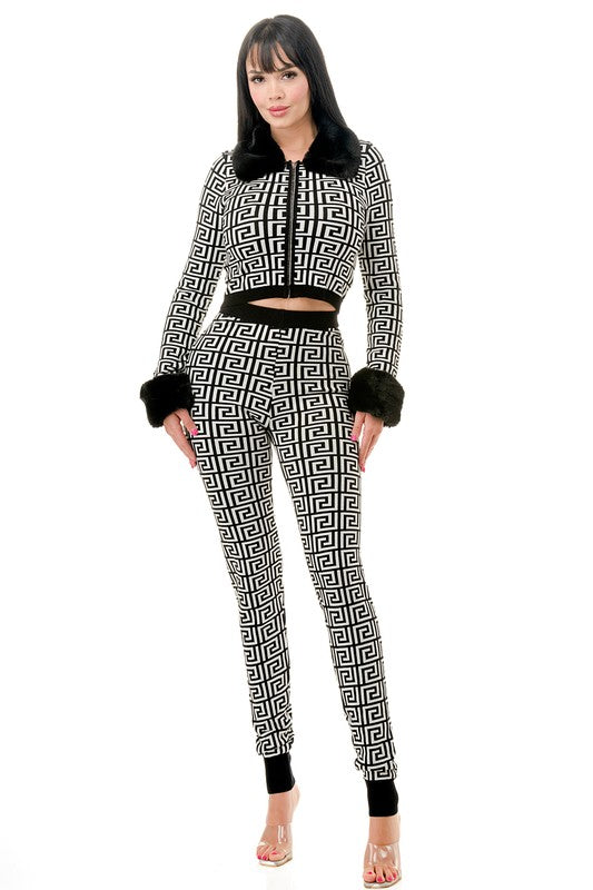 Monogrammed Pattern 2 Piece Sweater Knit Set -Jacket with Fur Details and Pants -Model is wearing small -Self: 72%Viscose 28%Nylon