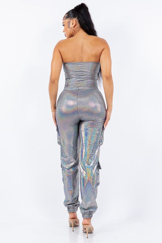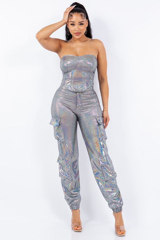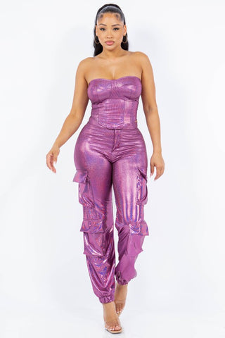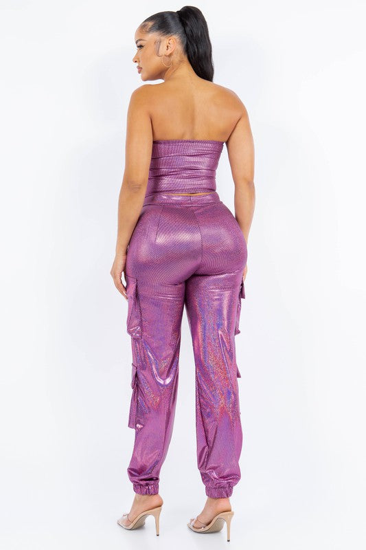 2PCS as a set, Pull-up stretchy leather Cargo Jogger Pants with a high-rise waist, side pockets, and tops. The model is wearing a size small. Made in USA.