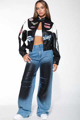 - Features: Mid rise, Relaxed fit straight legs silhouette, Full length bodioce, 2 Side pockets, Front contrast black spray print detail. - Fabric: Medium weight durable cotton blend stretchy denim jeans - True to size