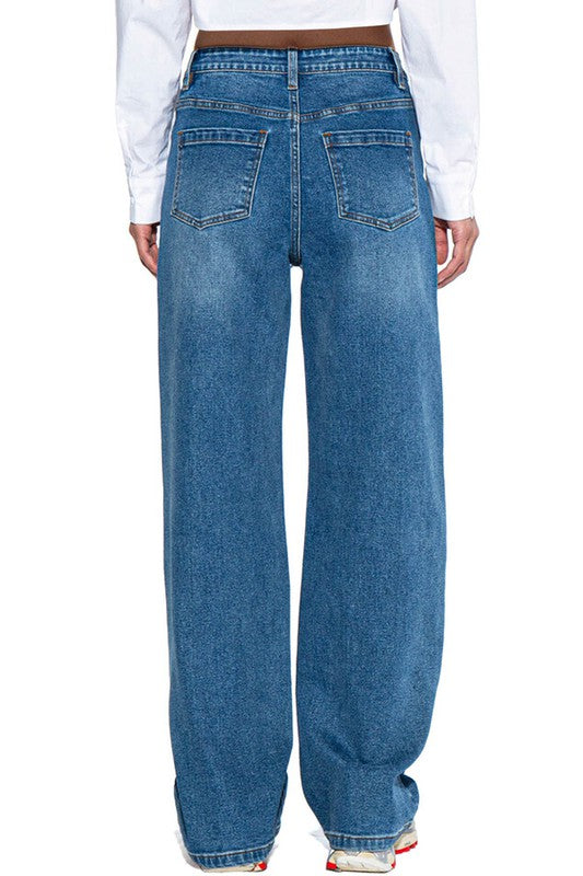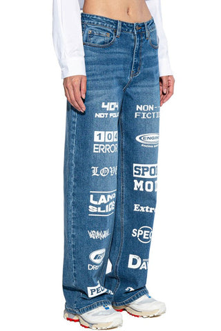 - Features: Mid rise, Full length straight fit legs, Side pockets, All over graphic print. - Fabric: Medium weight durable cotton blend stretchy denim - True to size