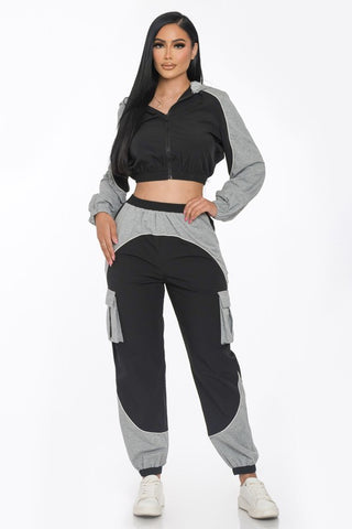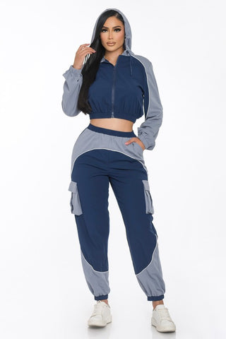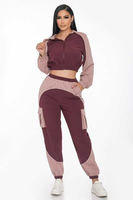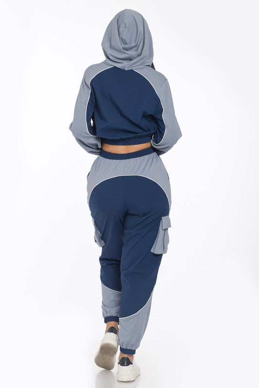 ATHLETIC JOGGER SET FEATURING AN ALLOVER COLOR BLOCK DESIGN, ELASTICIZED TRIM, FUNCTIONAL POCKETS, DRAWSTRING HOODIE AND CONTRAST PIPING.