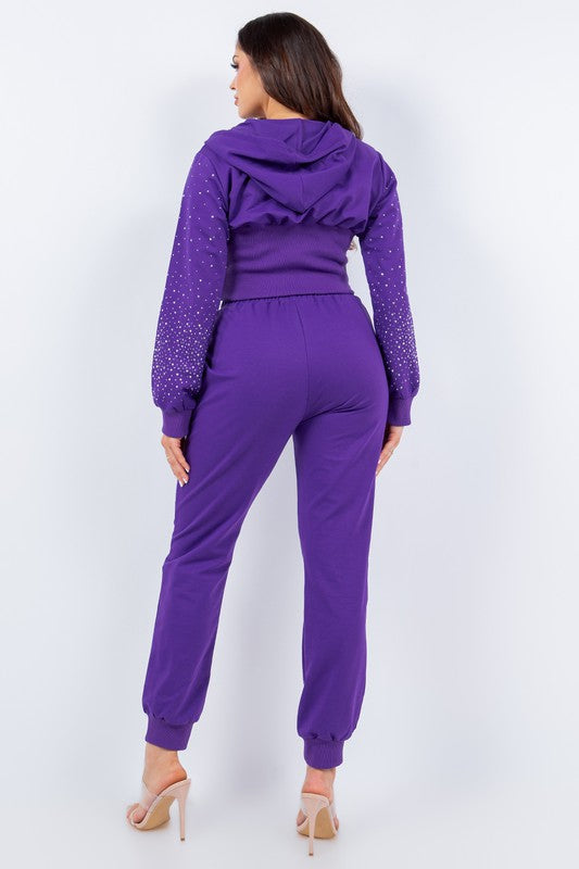 Two-Pieces glitter sets with open front zipper, Stretch cotton fabric, model is 5'7 wearing size S