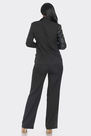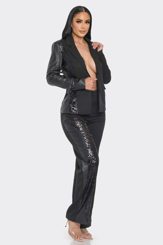 FEATURING A COLOR BLOCK MATERIAL OF SEQUIN AND PU LEATHER BLAZER AND SRIAGHT LEG PANTS WITH HOOK CLOSURE. PERFECT FOR A BUSINESS LOOK TO SHOW OFF.