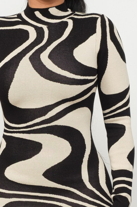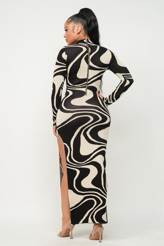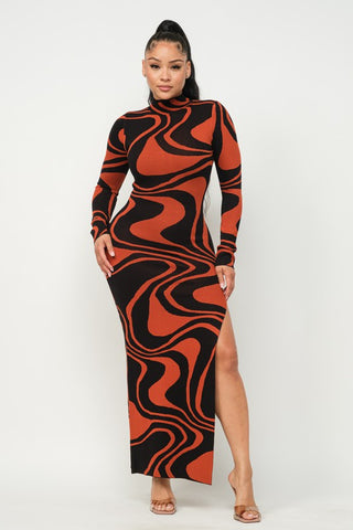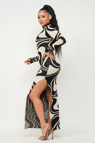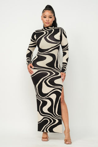 GROOVY WAVE JACQUARD MAXI SIDE SLIT DRESS - 70% RAYON 30% NYLONBLACK/WHITE SHIPS AFTER THANKSGIVING