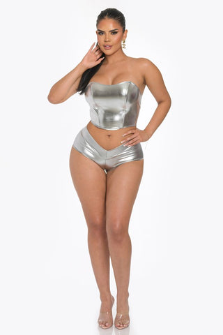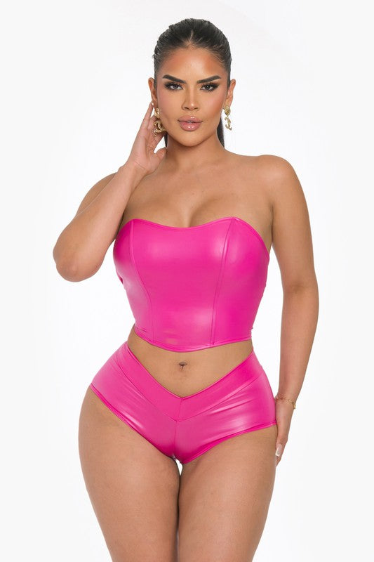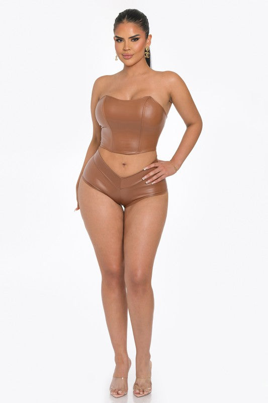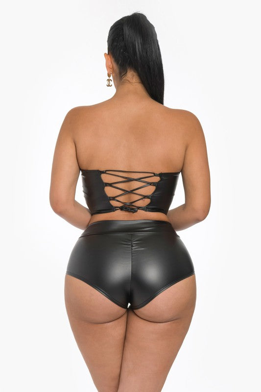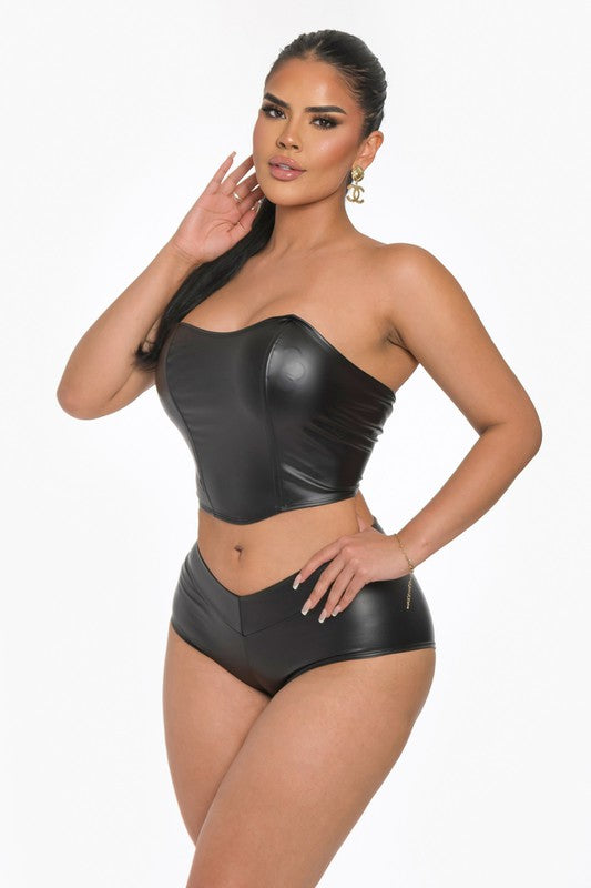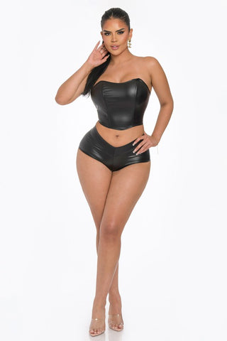 Plus size Set of Women's short leather and top. The model is wearing a size: Small Top and short 2pcs